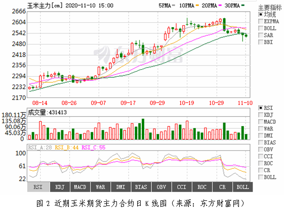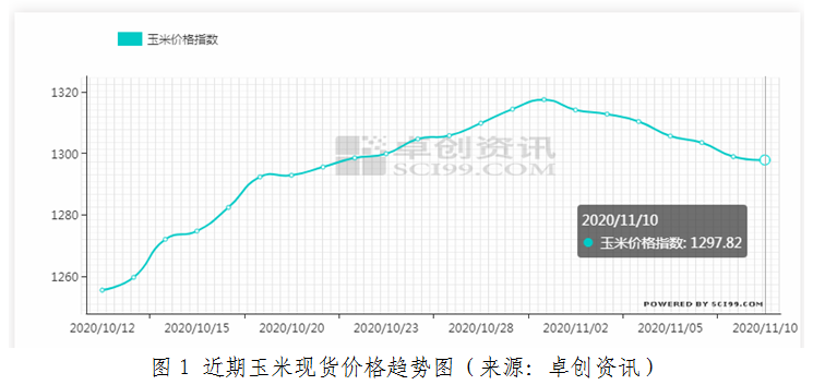 截至11月10日,大连玉米2101合约报收2572元/吨,周比上涨25元/吨。
