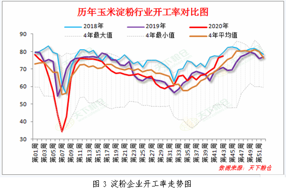 近期陕西地区玉米价格整体稳中有降。随着国家临储粮销售成交的火热进行,政策性粮源供给不断加大,市场阶段性供应压力得到缓解,近期国内玉米市场开始降温。而随着秋粮收购的全面展开,我省玉米市场与周边市场联系不断加深,截至11月5日,西安国维淀粉公司的玉米收购价格为2,500元/吨,宝鸡阜丰公司的收购价格为2,500元/吨,鲁洲生物玉米收购价格25水分以下价格2480元/吨,均较前一日下跌40元/吨,25水分以上价格2,500元/吨,与前日持平。随着原料玉米价格高位回落,淀粉企业挺价意愿松动,市场观望情绪仍在,淀粉价格维持稳定,截至11月6日,西安国维玉米淀粉出厂参考报价在3,250元/吨,与上一日持平。