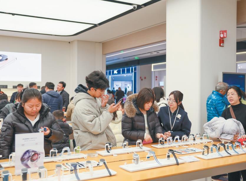 今年西安市提质增效实施消费品以旧换新,众多商场也推出促销活动,促进消费市场持续火热。图为1月1日,消费者在西安市雁塔区某商场选购数码和智能商品(资料照片)。 (记者 陈玮摄)