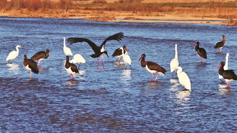 11月18日清晨,41只国家一级保护动物黑鹳在榆林榆溪河畔栖息觅食。素有“鸟中大熊猫”之称的黑鹳,对水质、植被等生存环境要求极高,全球野生种群仅约3000只,属濒危物种。图为榆溪河上,黑鹳与白鹭游弋、觅食,灵动的身影勾勒出和谐的生态画卷。 (通讯员:张喜利)