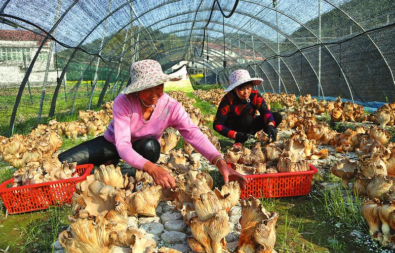 3月26日,务工村民在采摘褐灵菇。汉中菌多多农业发展有限公司采取公司+合作社+农户+贫困户的形式,在南郑区湘水镇盘龙庵村、五里店村建设食用菌种植栽培示范基地,以入股、务工形式带动贫困户近百人。