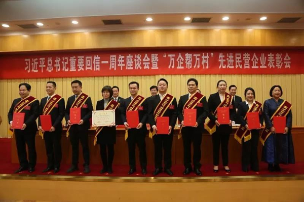 2019年10月17日,全国工商联、国务院扶贫办在京召开2019年全国“万企帮万村”精准扶贫行动先进民营企业表彰大会,授予99家民营企业全国“万企帮万村”精准扶贫行动先进民营企业荣誉称号。