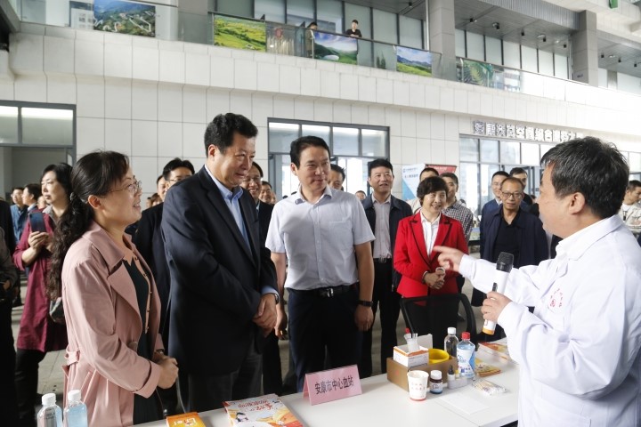 蒋庄德宣布2019年陕西省暨安康市全国科普日科技助力脱贫攻坚主场活动开始后,出席活动的领导参观科技助力脱贫攻坚成果展,看望了参加科技宣传、义诊咨询的工作人员。