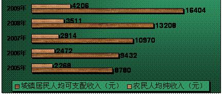 全市农民人均纯收入4206元,增长19.8%;城镇居民人均可支配收入16404元,增长24.2%。农村居民家庭食品消费支出占消费总支出的比重为37.1%,城镇为33.7%。