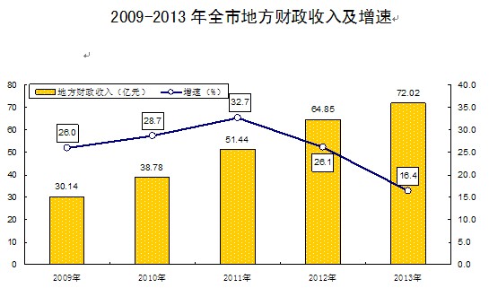 全年财政总收入171.65亿元,比上年增长7.8%,其中地方财政收入72.02亿元,增长16.4%。全年全市税收收入148.10亿元,增长7.7%。其中:国税收入98.86亿元,增长7.5%;地税收入42.0亿元,增长2.4%。