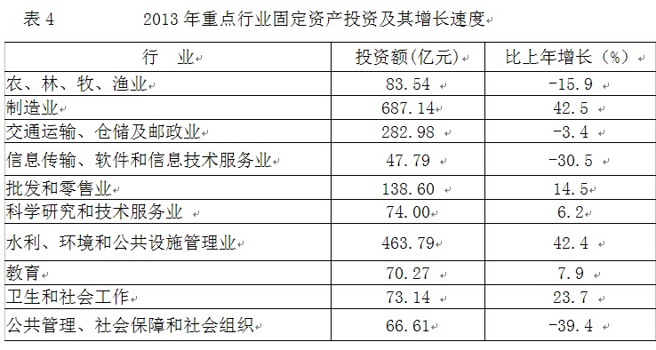 在固定资产投资(不含农户)中,第一产业投资73.15亿元,比上年下降26.4%;第二产业投资983.09亿元,增长46.3%,其中,工业投资868.57亿元,增长50.2%;第三产业投资3998.99亿元,增长17.8%。