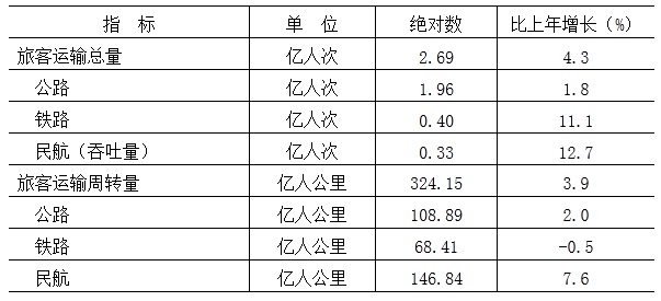 全年货物运输总量4.63亿吨,比上年增长10.1%;货物运输周转量643.01亿吨公里,增长2.9%。旅客运输总量2.69亿人次,增长4.3%;旅客运输周转量324.15亿人公里,增长3.9%。