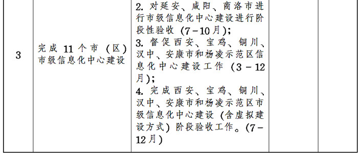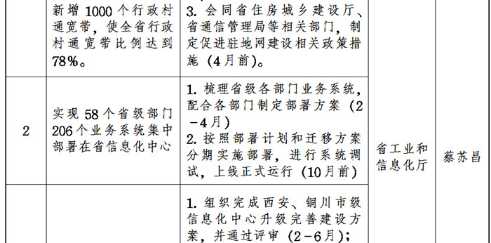 (五)信息化建设工作目标。加速建设宽带陕西。全省光缆总长超过45万公里,实现4M及以上宽带用户超过70%,新增固定宽带接入家庭超过150万户。新增1000个行政村通宽带,使全省行政村通宽带比例达到78%。建成信息化基础资源综合服务体系,实现78个部门206个业务系统基于省中心统一部署。2013年全面建成11个市级中心和106个县级平台。加快城市社会领域信息化,推进信息惠民。发布数字陕西智慧城市五年发展规划,重点启动社会公共服务一卡通、智慧城市、食品安全监管、国家人口计生委数据处理与备份(西安)中心建设,继续实施重点镇“数字城镇”示范项目。推动“两化”深度融合。以集团企业管控信息化和国家、省级工业园区信息化建设为重点,树立“两化”融合示范企业20家、建设示范项目50个。推进西咸、宝鸡、榆林等两化融合试验区建设。此项工作由省工业和信息化厅牵头落实。(责任分工详见附件5)