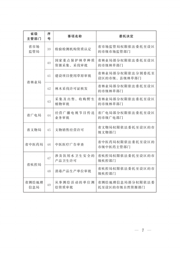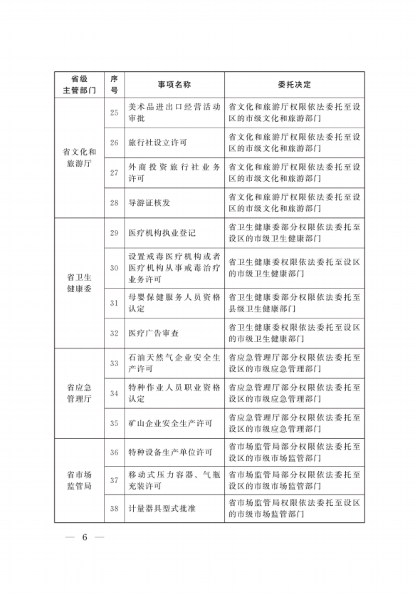 根据《中华人民共和国行政许可法》规定和《国务院办公厅关于全面实行行政许可事项清单管理的通知》(国办发〔2022〕2号)要求,按照国务院办公厅公布的《法律、行政法规、国务院决定设定的行政许可事项清单》,经研究,决定公布《行政许可事项委托清单》(见附件),将省级行政机关相关行政许可事项依法委托给设区的市、县级行政机关。省级行政机关将部分行政许可权限委托给设区的市、县级行政机关的,应当根据国务院有关部门制定的行政许可事项实施规范所规定的实施层级和实施内容,会同受委托的行政机关依法确定委托内容。委托事项由具有行政许可权限的省级行政机关与受委托的设区的市、县级行政机关依法签订委托书后实施。受委托的设区的市、县级行政机关不得就委托事项再行委托。