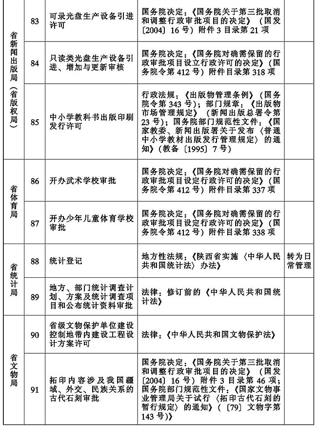 2010年8月以来,根据《国务院关于第五批取消和下放管理层级行政审批项目的决定》(国发〔2010〕21号)和《陕西省人民政府关于清理省本级行政审批项目有关事项的通知》(陕政发明电〔2010〕2号)要求,省政府组织对省级60个部门的行政审批项目进行了新一轮集中清理。经过严格审核论证,省政府决定第五批取消和下放管理层级行政审批项目147项。其中,取消的行政审批项目120项,下放管理层级的行政审批项目27项。