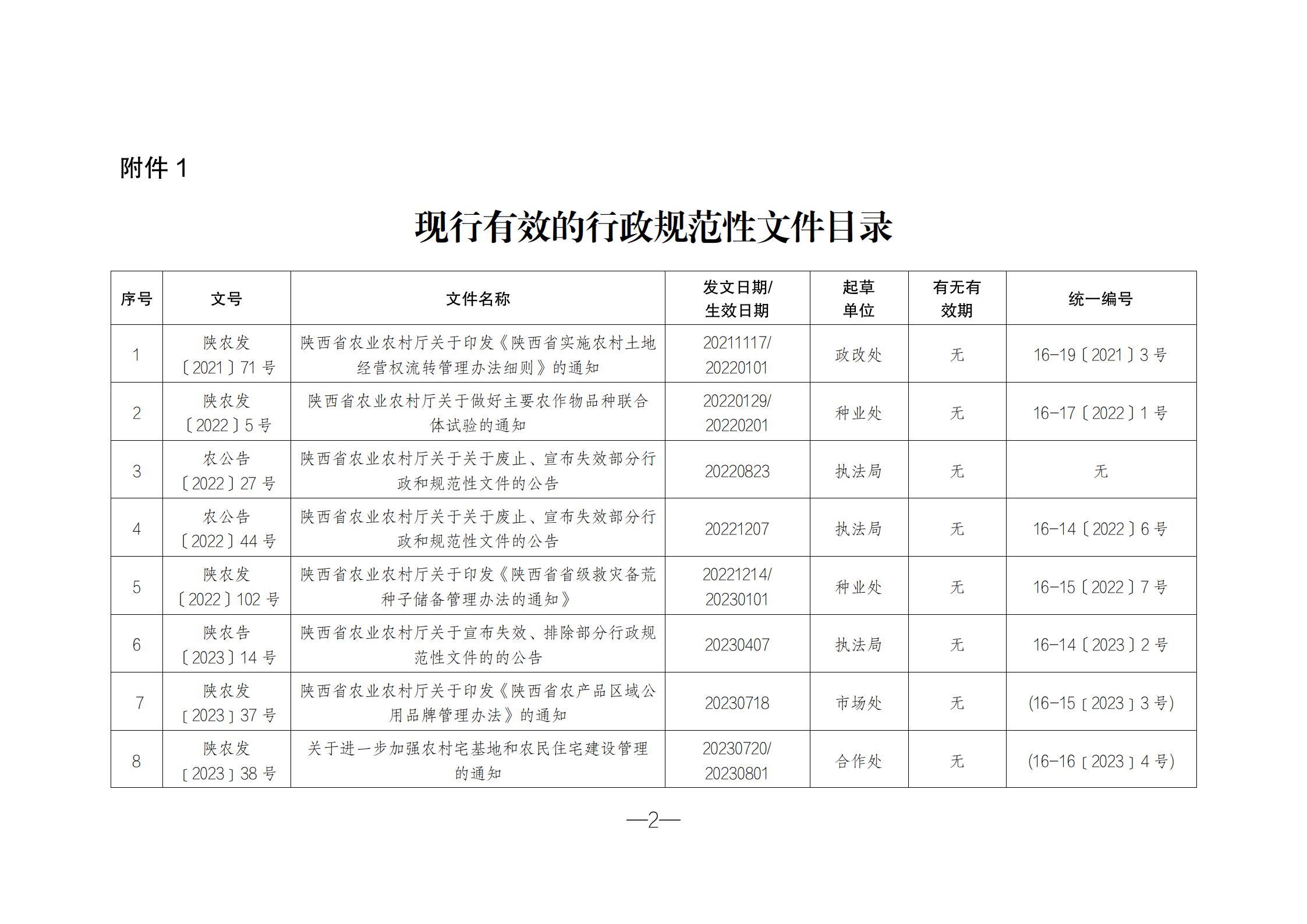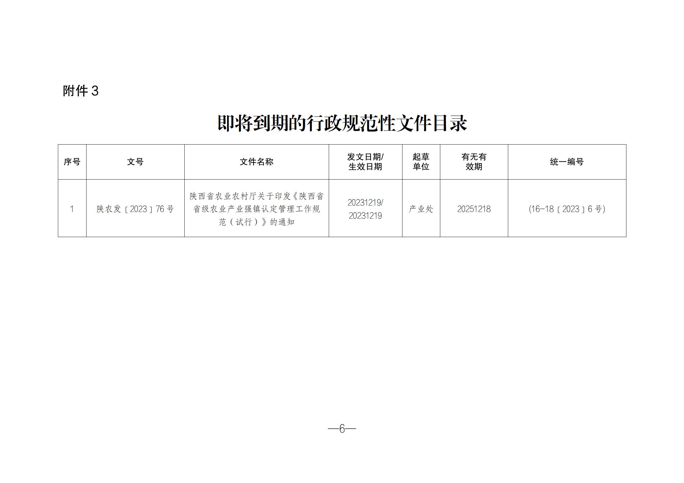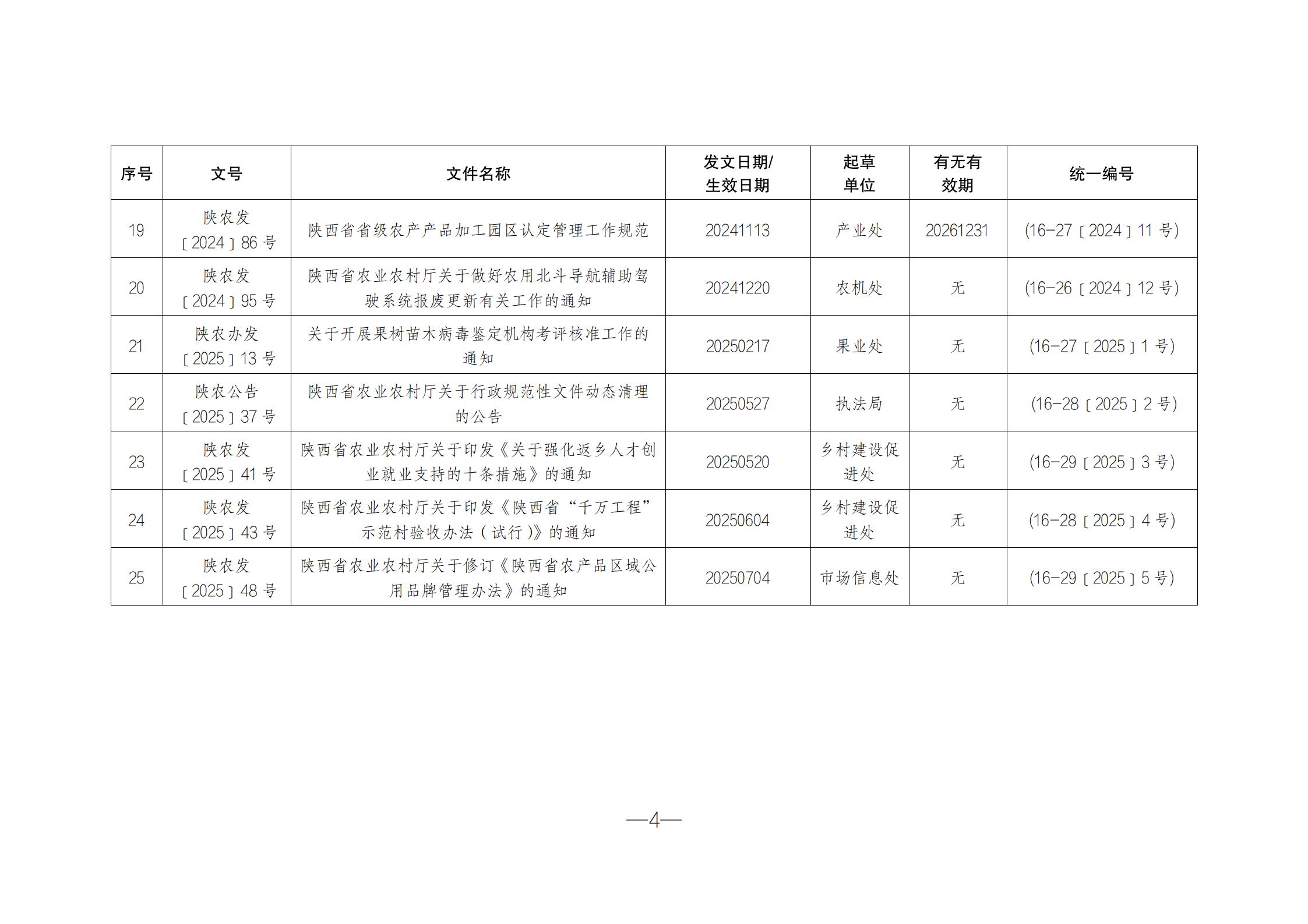 为加强行政规范性文件动态管理,根据《陕西省农业农村厅行政规范性文件制定和监督管理办法》规定,按照省委省政府对涉企优惠政策文件的整改要求,我厅对2025年7月31日之前制定出台的行政规范性文件进行了动态清理,现将清理结果予以公布。